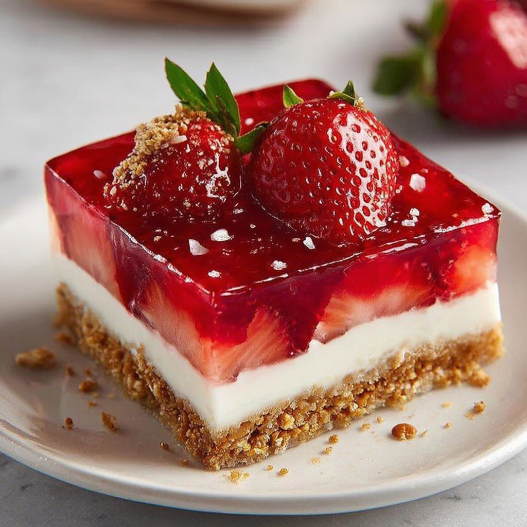 Once set, slice into squares and serve chilled. The presentation is appealing with the distinct layers showcasing the vibrant strawberries and creamy filling. The textured contrast between the salty pretzel crust and sweet, tangy strawberries creates a delightful experience that will have everyone going back for seconds.